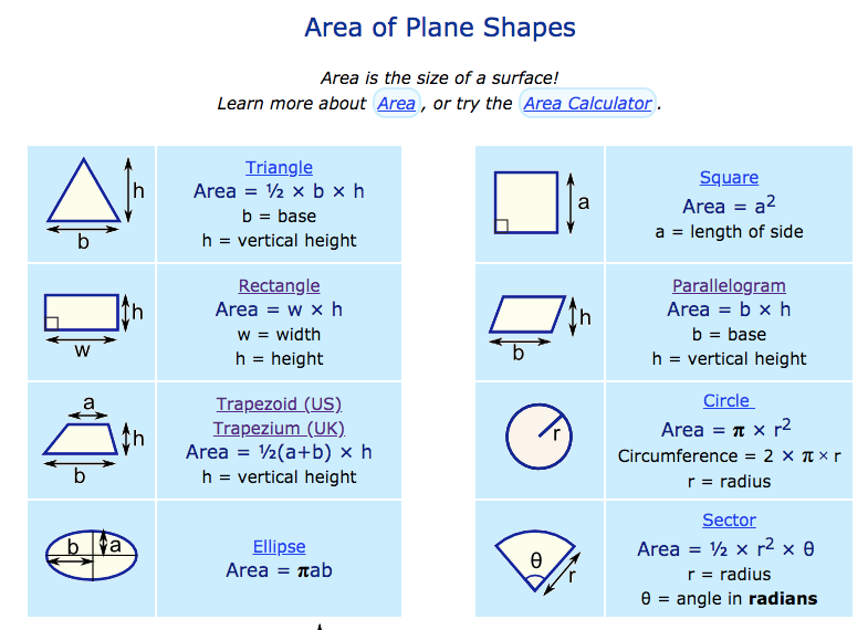 CR :: https://medium.com/all-math-before-college/area-perimeter-surface-volume-of-shapes-geometry-cb8e702c2dc8 , https://sciencenotes.org/surface-area-formulas-volume-formulas/