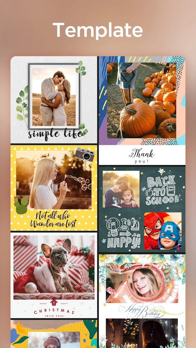 สุดยอดแอปรวมภาพง่าย ๆ มีกรอบหลากหลายแบบ ปรับสัดส่วนได้ตามต้องการ มีเครื่องมือให้ใส่ตัวหนังสือ สติกเกอร์หลายธีม ใส่ฟิลเตอร์ หรือขีดเขียนได้ลงบนภาพ เรียงภาพได้ทั้งแนวนอนและแนวตั้ง ส่วนใหญ่เป็นฟีเจอร์ง่าย ๆไม่ซับซ้อน
